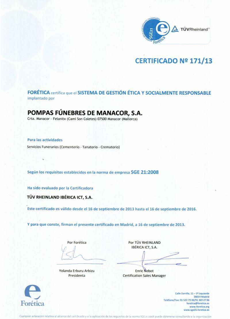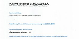 08-10-2013Pompas Fúnebres Manacor S.A. ha sido certificada por la entidad Tüv Rheinland Iberica SCT, juntamente con FORETICA por implantar politicas sociales en su gestión.-