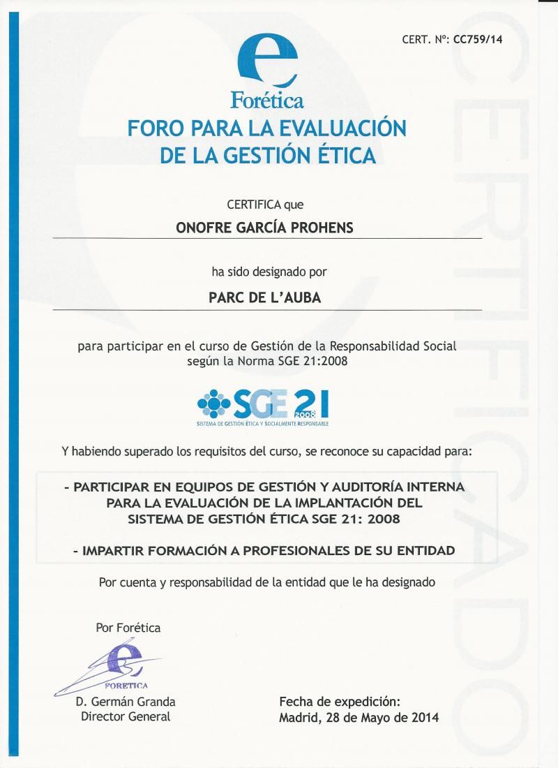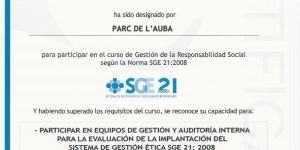 12-06-2014El Administrador de la entidad Parc de l′Auba, D. Onofre Garcia Prohens ha participado en el curso de Gestión de la Responsabilidad Social según norma SGE 21:2008, certificando su capacidad para participar en equipos de gestión y auditoria interna asi como impartir formación a los profesionales de dicha entidad