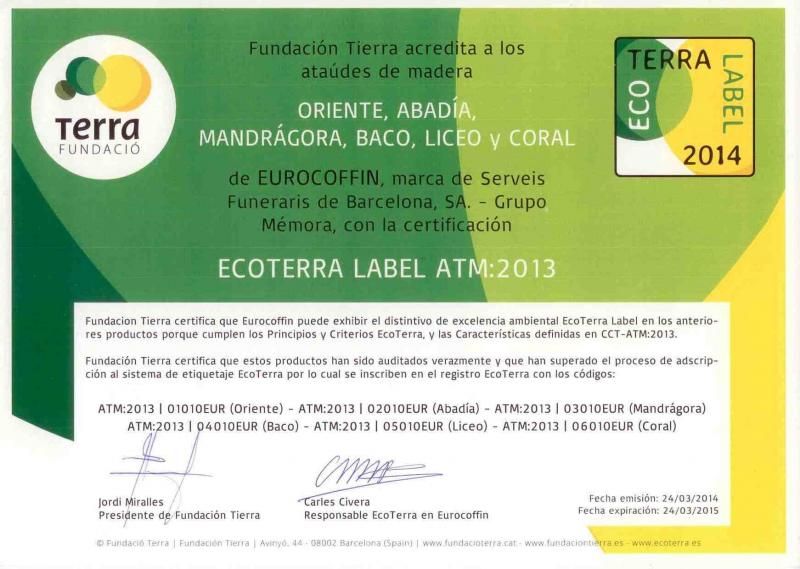 24-06-2014Parc de l′Auba conscientes de la necesidad de minimizar el impacto de nuestras actividades en el medio ambiente inicia la comercializacion de ataudes con certificación "ECOLABEL", fabricados con maderas procedentes de plantaciones PEFC y barnices con base al agua cumpliendo los requisitos establecidos en la norma UNE 190001:2003